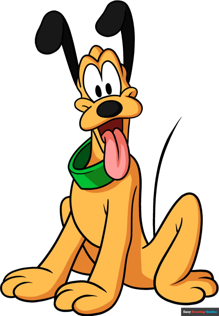 Pluto’s posture exudes the potential for motion. His ears and tail are erect. He wears a loose, round collar around his neck, and his tongue is hanging out.