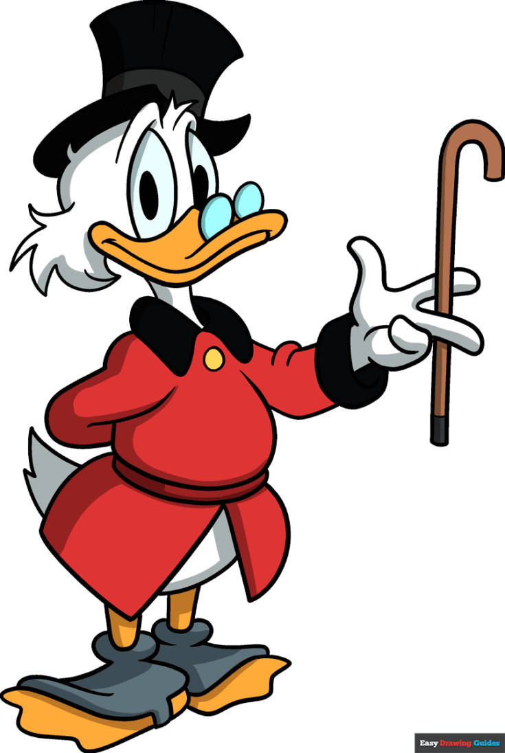 Donald and his uncle look a lot alike. What sets Scrooge apart are his top hat, glasses, hooked cane, robe, and shoes. These make him appear sophisticated since he is very rich.
